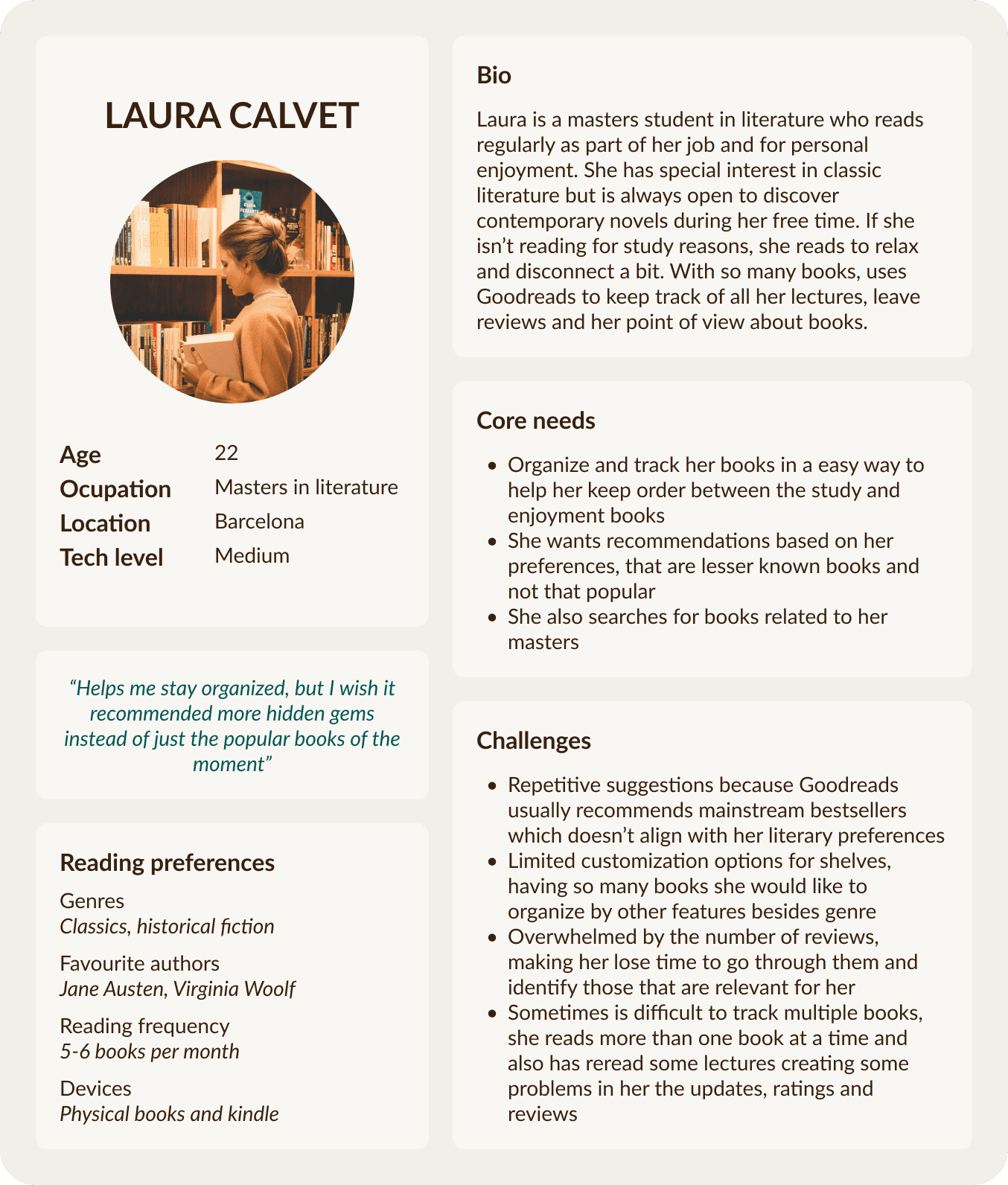 To enhance user interaction and engage more connections between readers, the proposal is focused on the redesign of the profile page based on the needs of the user personas. This will allow a more personalized and accurate profile to help different type of readers discover books by connecting with users with similar interests in a easier way. Additionally, the new features added to the existing ones creates a versatile profile depending on the user sharing preferences with others, resulting in a more engaging and community-focused experience.